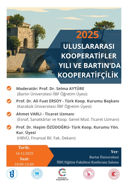 16 Aralık 2025 Salı günü saat 10:00'da Fakültemiz ile Bartın Ticaret İl Müdürlüğü'nün birlikte düzenlemiş olduğu "2025 Uluslararası Kooperatifler Yılı ve Bartın'da Kooperatifçilik" başlıklı bir panel düzenliyoruz. Birleşmiş Milletlerin alımış olduğu kararla 2025 Kooperatifler yılı ilan edilmiştir ve ülkemizde Cumhurbaşkanlığımız kararı ile "2025-2029 Kooperatifçilik Stratejisi ve Eylem Planı" yürürlüğe girmiştir. Panelimiz Prof. Dr. Selma AYTÜRE hocamız moderatörlüğünde Türk Kooperatifçilik Kurumu başkanı ve Karabük Üniversitesi İİBF Sosyal Hizmetler Bölümü Öğretim Üyesi Prof. Dr. Ali Fuat ERSOY, Türk Koop. Kurumu Yönetim Kurulu Üyesi HBVÜ Finansal Bilimler Fakültesi Dekanı Prof. Dr. Haşim ÖZÜDOĞRU ve Ticaret Bakanlığından Ahmet VARLI panelist olarak katılacaktır. Panelimize tüm kıymetli öğrenci ve hocalarımızı bekliyoruz.