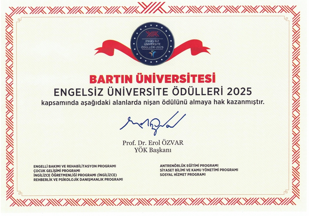 Yükseköğretim Kurulu (YÖK) tarafından üniversitelerde engelsiz bir ekosistemin oluşturulmasını teşvik etmek amacıyla “Engelsiz Üniversite Bayrakları ve Program Nişanı Ödül Töreni” düzenlendi. Törende, engelsiz üniversite ve erişilebilir kampüs anlayışıyla önemli çalışmaların yapıldığı Bartın Üniversitesinin (BARÜ) 7 programı “Engelsiz Üniversite Program Nişanı” aldı. Böylece BARÜ, en çok nişan alan ilk 7 yükseköğretim kurumu arasında yer alırken engelsiz ve erişilebilir üniversite vizyonunu bir kez daha tescilledi. Fakültemiz Siyaset Bilimi ve Kamu Yönetimi Bölümü, erişilebilir ve kapsayıcı eğitim anlayışı doğrultusunda yaptığı çalışmalar ile “Engelsiz Üniversite Program Nişanı” almaya hak kazandı.